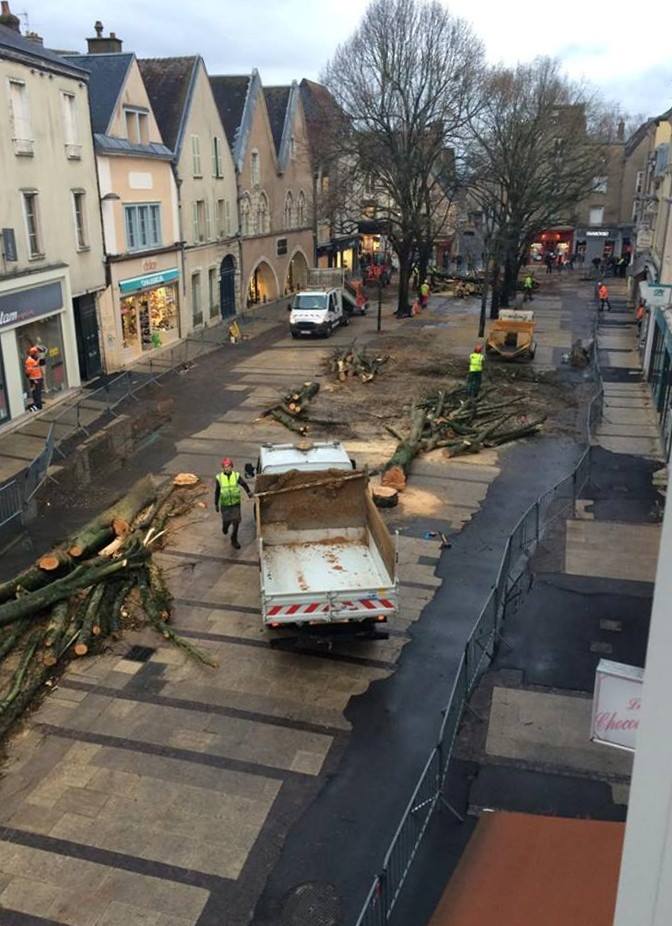 Depuis cet été 2015, des habitants de Chartres essayent de défendre les 16 tilleuls de la place du cygne, car le maire veut les abattre, pour rénover la place.. 6 déc 2015 : un collectif se créé, mais malgré leur action et le soutien de personnalités du monde des arbres, les 16 tilleuls sont abattus le 11 janvier 2016, la place est tristement vide.